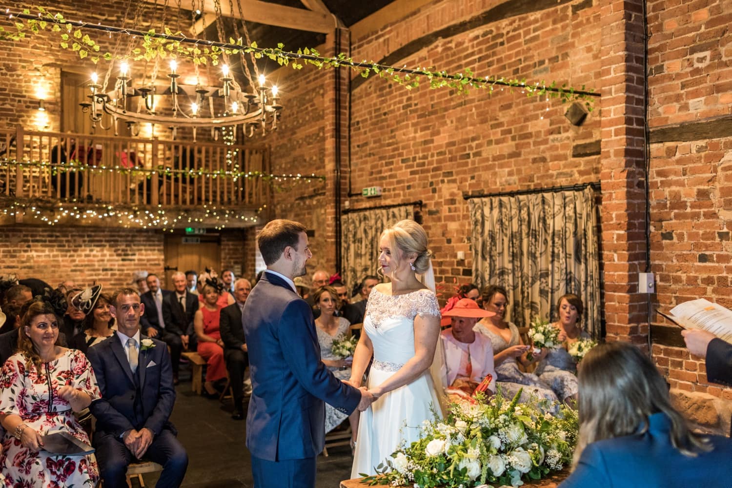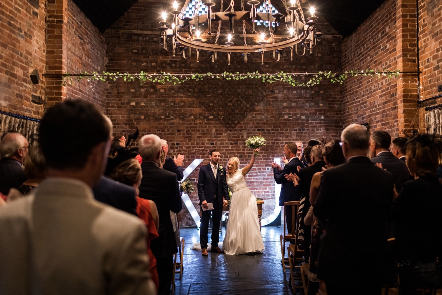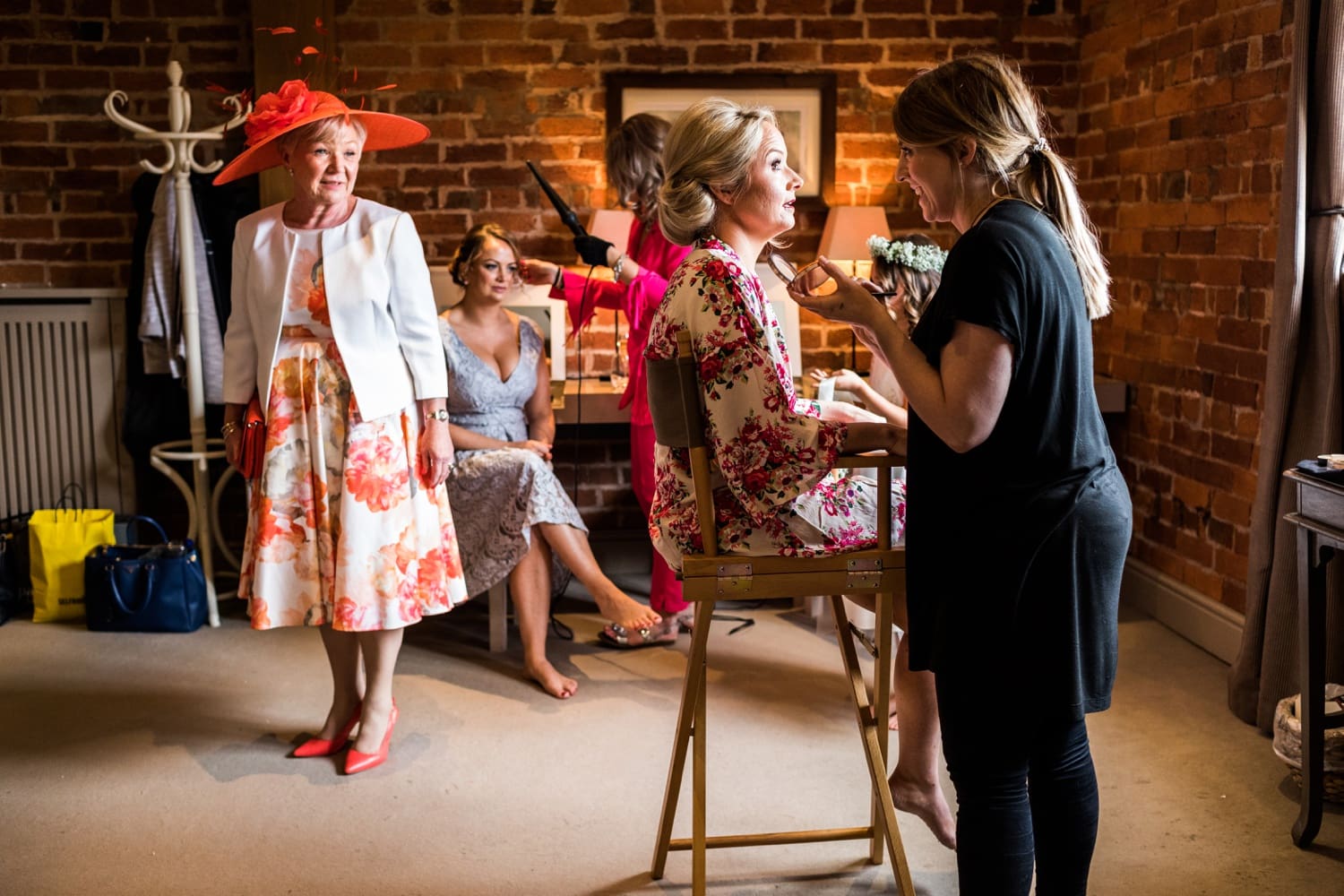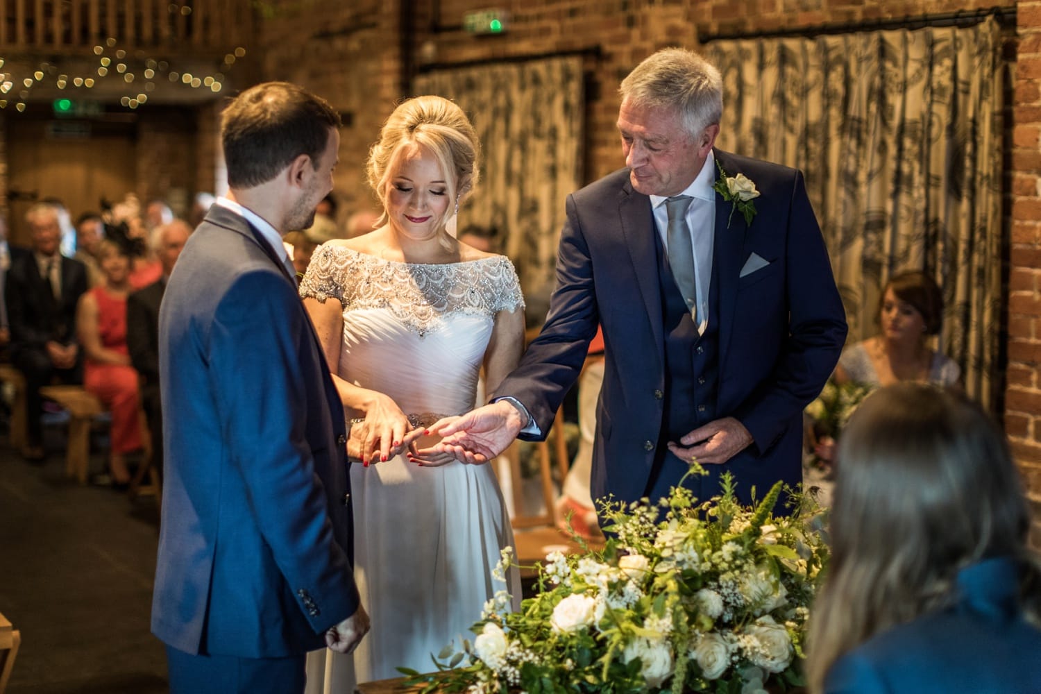 On 2nd October I travelled just over the English border to the county of Worcestershire. I had made the journey to photograph the wedding of Katherine and James at Curradine Barns. This West Midlands wedding venue is set in the heart of the countryside and includes a perfect example of restored early 19th century red brick rural architecture. I meet up with the bride and her entourage during their preparations for the big day, in the venues purpose built bridal dressing room. The groom, best-man, and usher, were also getting dressed on site, temporally making use of the honeymoon suite, situated in a little cottage amongst the gardens of Curradine. The marriage ceremony took place in the rustic granary barn, followed by drinks served in the picturesque courtyard, making the most of the warm autumnal day. The old barley barn provided the space for the formal wedding breakfast, boasting a light and airy colour scheme, bathed in natural light thanks to the wall of picture windows overlooking the courtyard.
